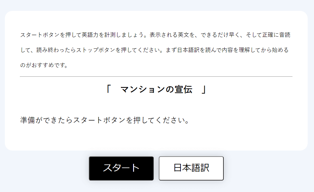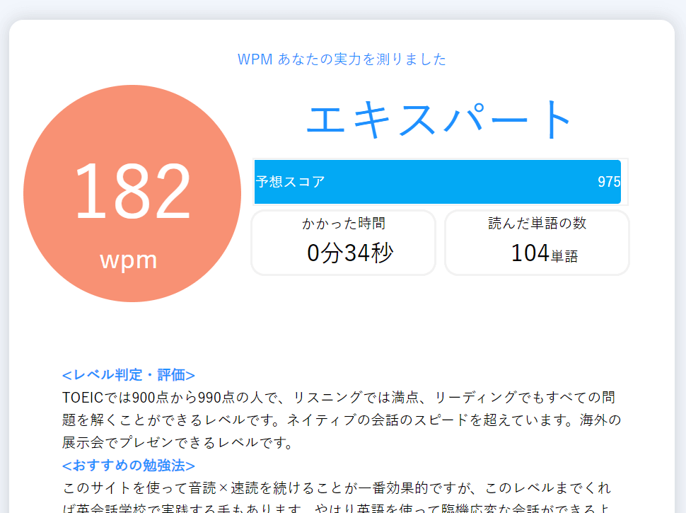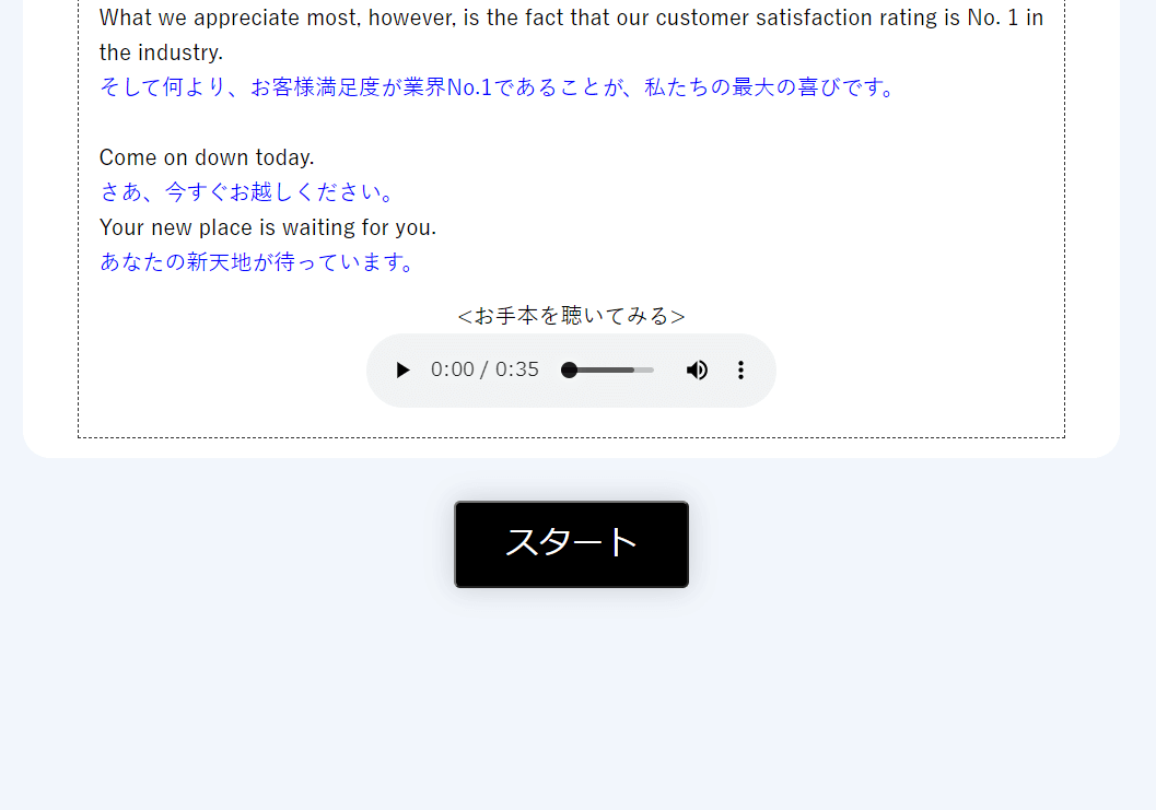 最初に日本語訳を読んで、しっかり理解してからwpmの測定を始めることをおすすめします。日本語訳を読んでみる場合は、「日本語訳」ボタンをクリックしましょう。お手本を聞くこともできます。