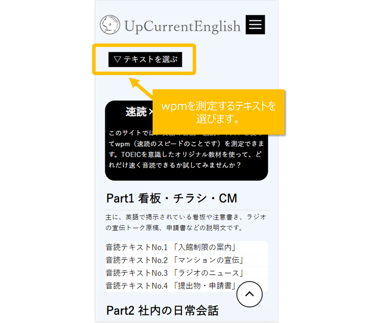 wpmを測定するテキストを選びます。※本サイトのどのページからでも選べます。